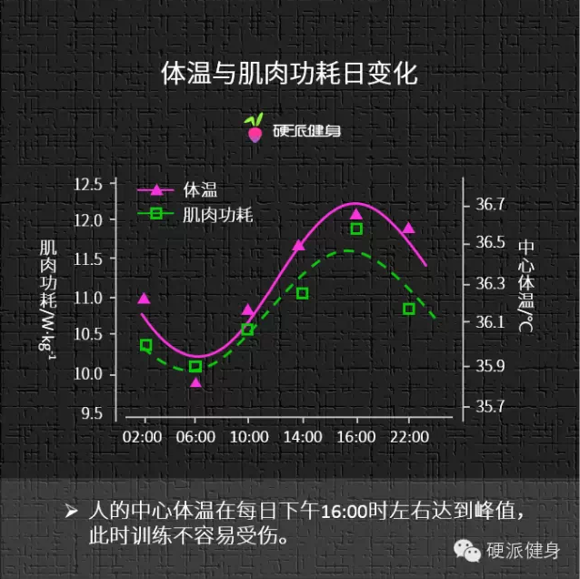 通过上述图表我们可以看出,人体的体温在16:02的时候到达了最高点。这就相当于人在这个时间段内被动热身,使肌肉的弹性组织增加了弹性,更加不容易断裂。所以这个时间段训练,受伤的几率会比其他时候小很多。