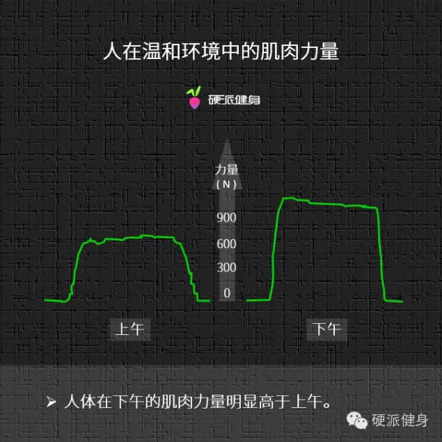 另一部分原因,是此时肌长度和肌张力都跟着加大了,因此力量也增大了。比如肌肉的最大自主收缩,与最低点相比将在下午升高6-18%⑦;再比如离心收缩和向心收缩也和人体的体温变化相似,在下午四点表现较高⑧。此外肘关节的屈力量和背部力量在下午的时候也达到高峰⑨⑩。
