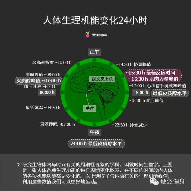 通过上面这张图可以看出,人的体温、血压、睾酮等在一天之内都在不停变化,这就决定了肌肉力量和激素水平,在一天之内也会有很明显的差异。