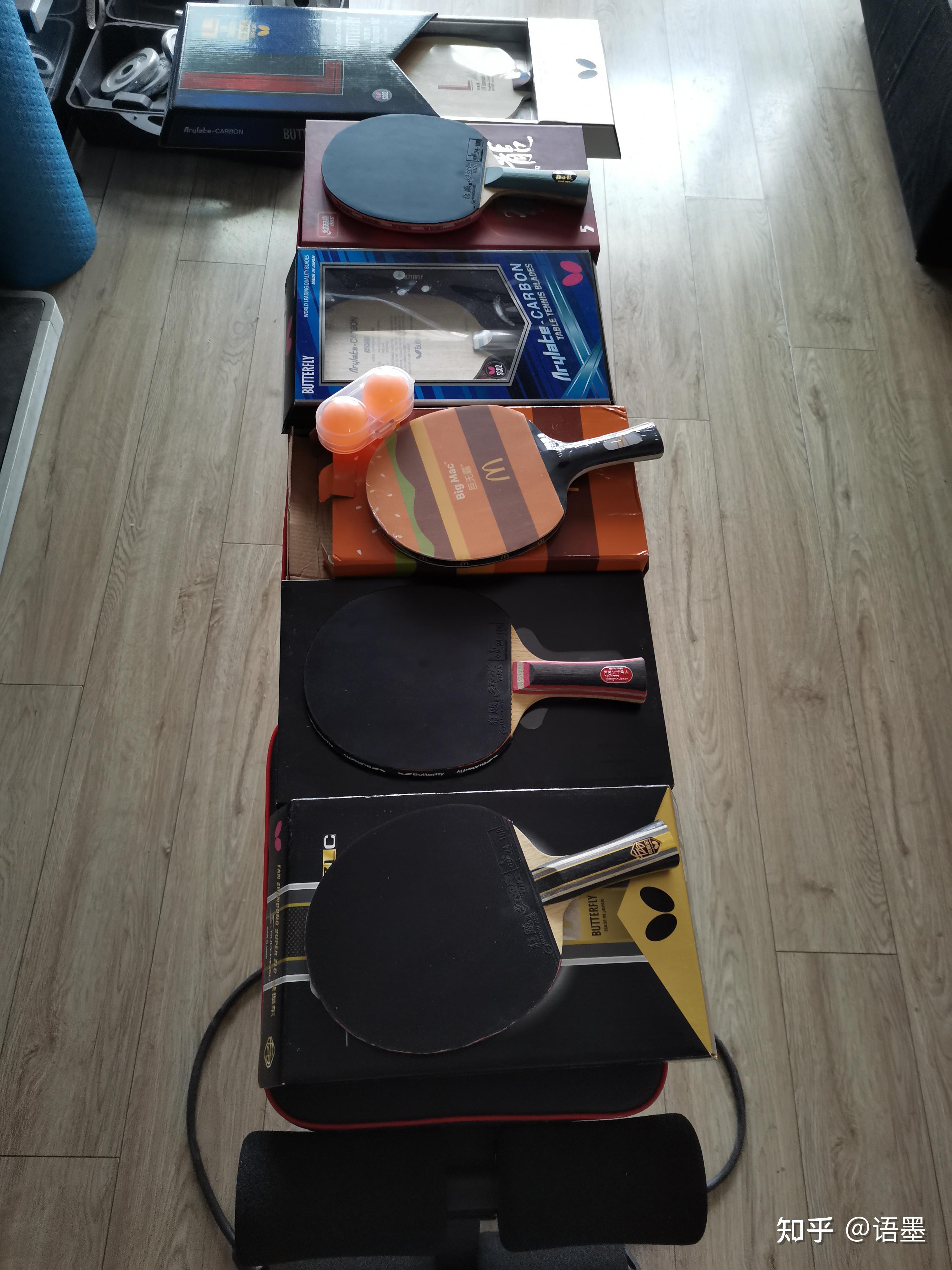 如图是我目前手上的拍子,器宗应该都认识吧,从娱乐级的麦当劳成品拍,到入门级的北欧七,到进阶级的vis和林高远alc,到顶级的樊振东szlc和w968