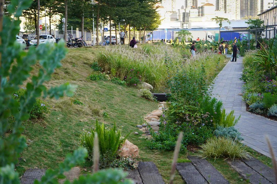 设计师利用下沉式绿地的汇集雨水的特征,因地制宜在草坡下设置生态旱溪和雨水花园,并加入火车枕木改造而成的独木桥,大大提升了海绵景观的观赏性和互动性。